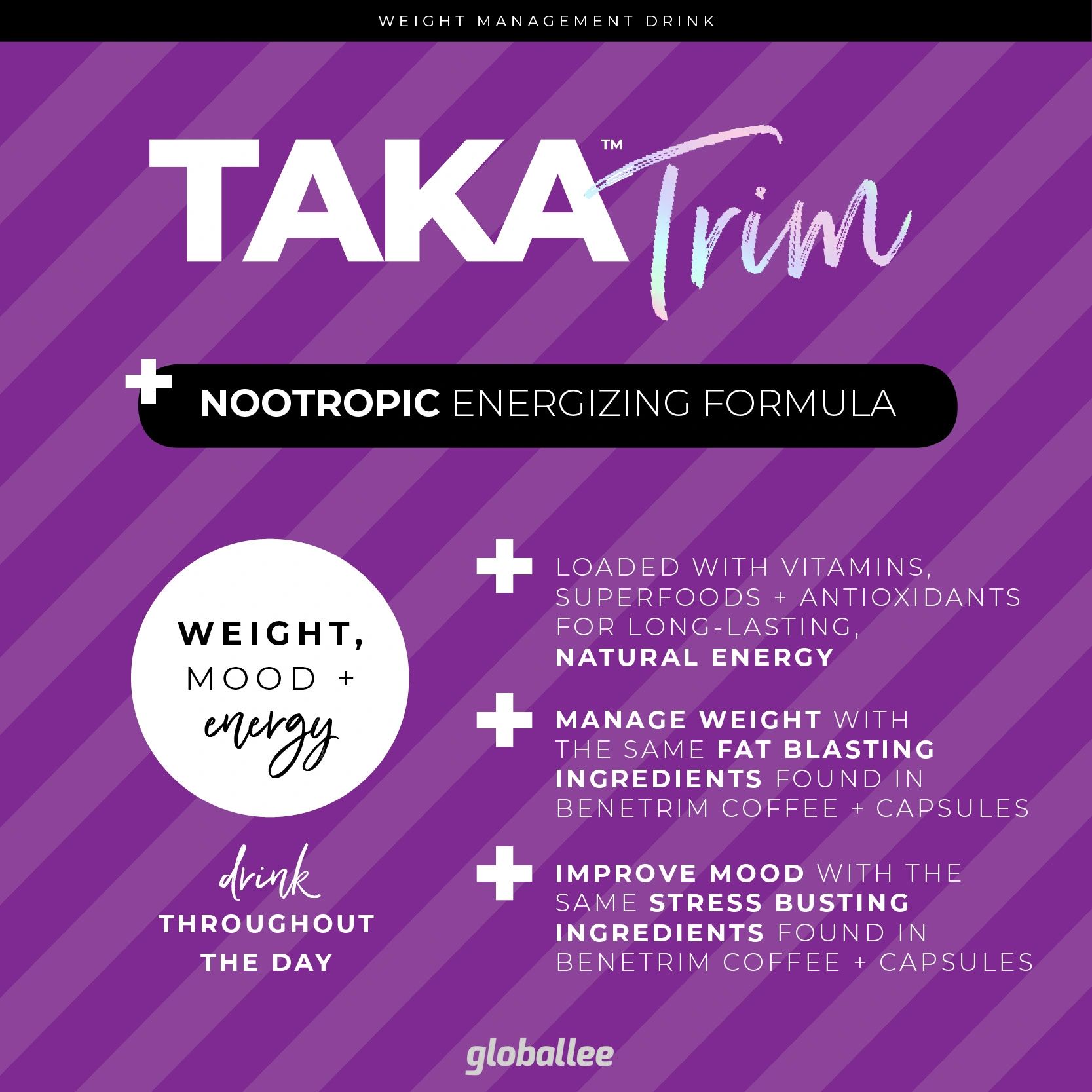 Web TAKATrim is a combination of the best ingredients in TAKA and BeneTRIM. Cut your cravings and improve your mood at the same time. Filled to the brim with.